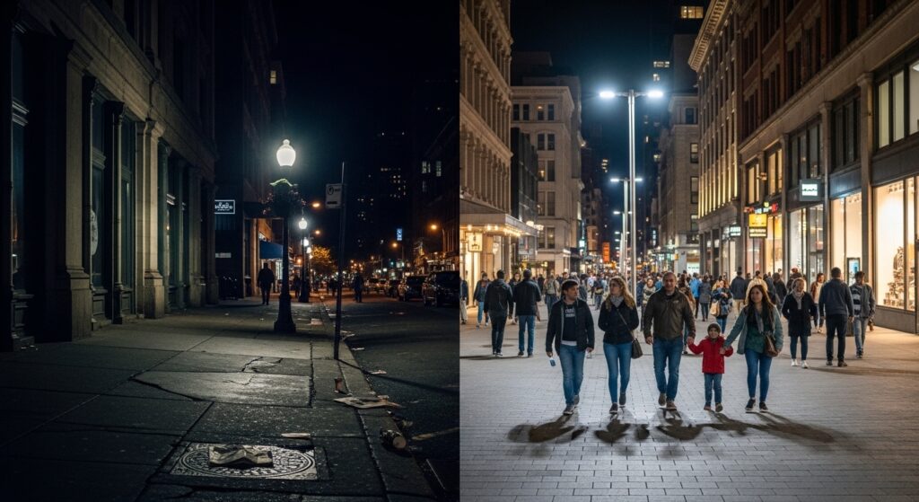 A percepção de segurança é um dos efeitos mais imediatos da iluminação urbana. Uma rua escura comunica abandono e risco, independentemente dos índices reais de criminalidade da área. Esse efeito psicológico influencia as escolhas de deslocamento das pessoas, que tendem a evitar trajetos pouco iluminados mesmo quando não há ameaça concreta.
